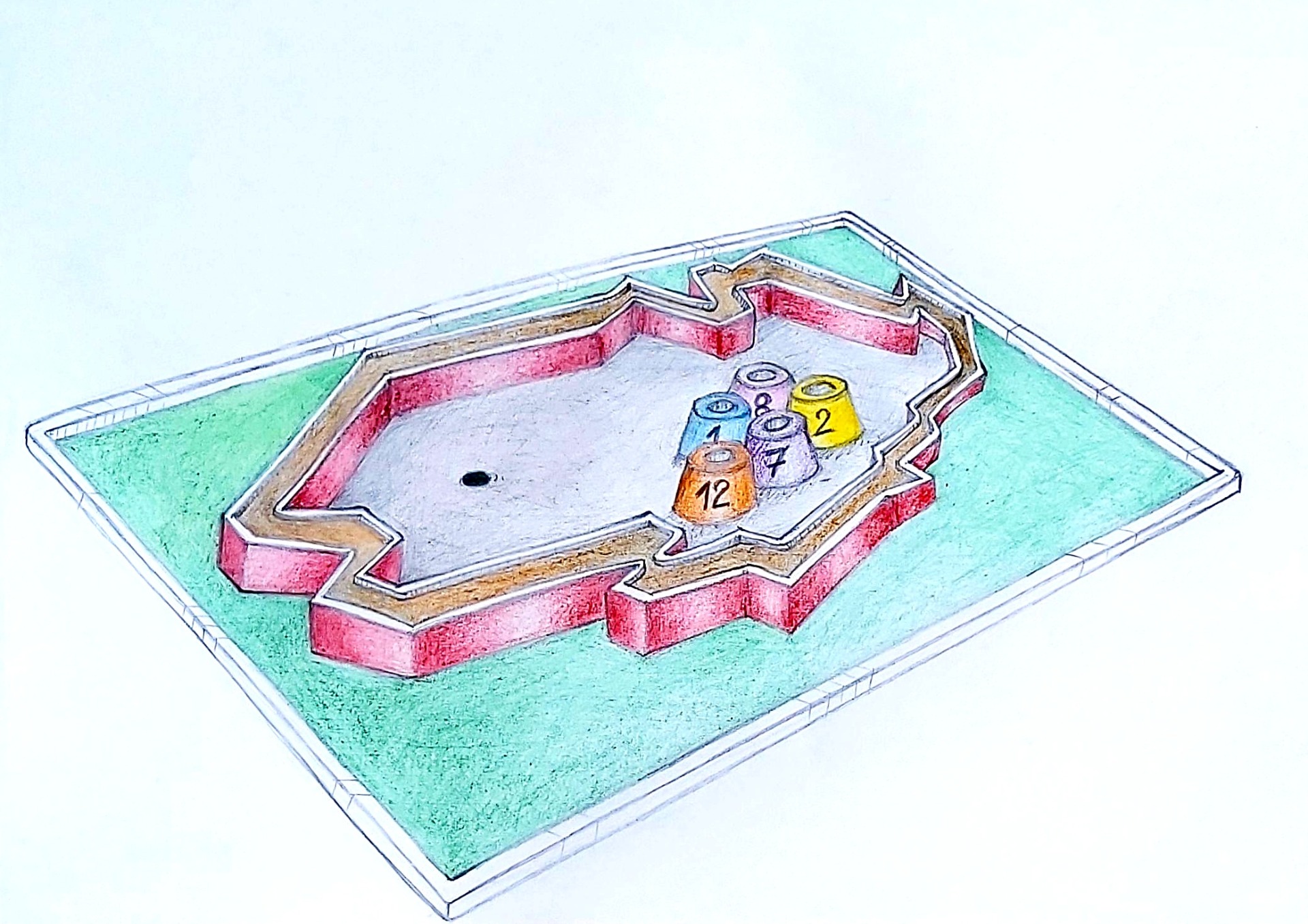 (Em baixo um dos vários projetos para "distribuir" pela escola para, de forma colorida e especial, sentar (pois não havia assentos no exterior da escola (edifício com 30 anos!) até DTDM começar a criar. Trata-se de outra pista com uns cones para acertar bolas de forma a oferecer concorrência ao "50" com a anterior, destinar-se-ía a fomentar rivalidades sãs. A ideia é brincar à vida e... às disciplinas!)). Pode ser uma "sala de aula".